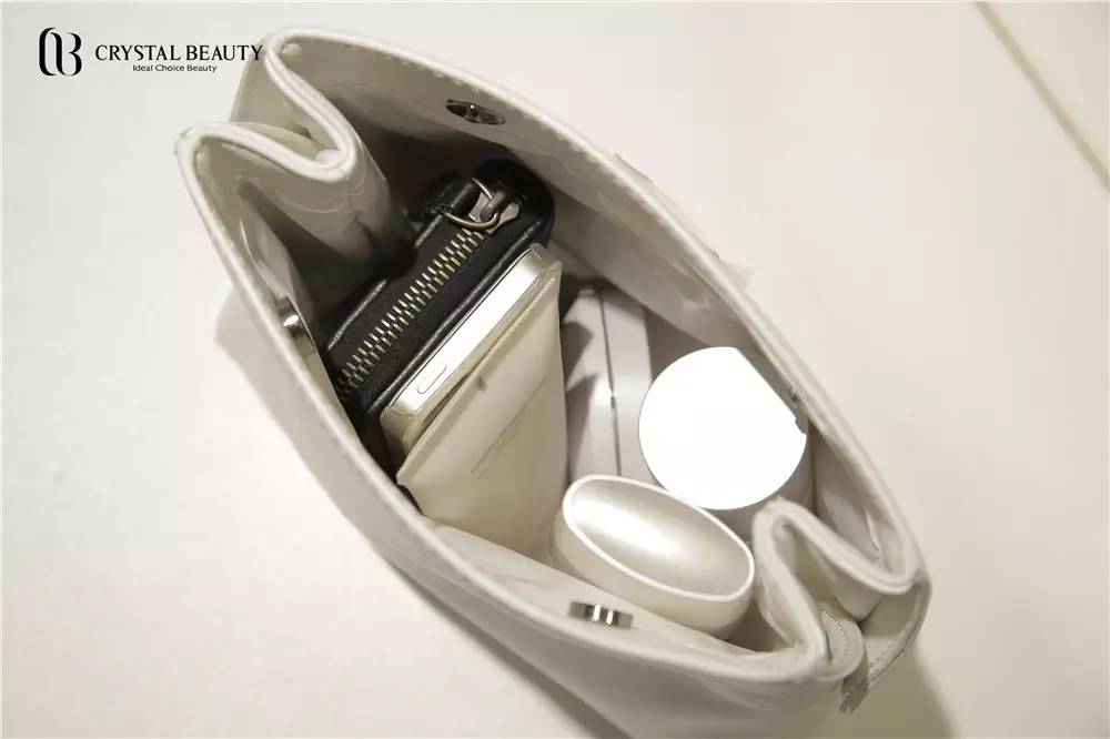 看著嬌小的包包,其實(shí)有容乃大。里面不僅可以放置整一套CB護(hù)膚產(chǎn)品,也可以作為獨(dú)立的包包使用,放置錢包手機(jī)等等。如果你覺(jué)得不夠,還可以打開(kāi)兩側(cè)的金屬扣,空間立刻就來(lái)啦。